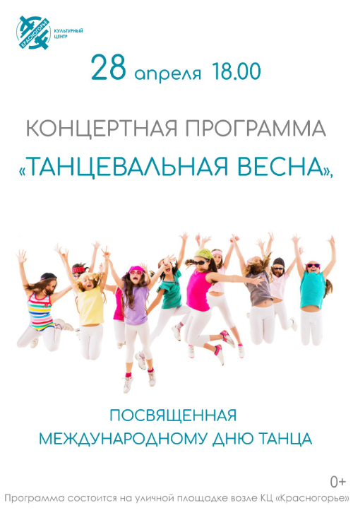 28 апреля в 18:00, на уличной площадке, возле КЦ «Красногорье» состоится концертная программа «Танцевальная весна», посвященная Международному дню танца.