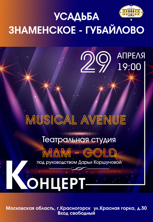 29 апреля в 19:00 в Главном доме Усадьбы Знаменское-Губайлово состоится Концерт "Musical Avenue" (мюзикл авеню) театральной студии МДМ - GOLD, руководитель Дарья Коршунова.