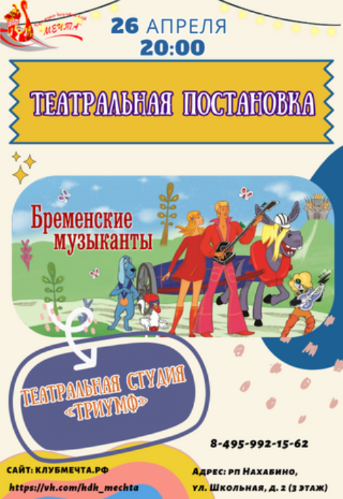 26.04.2023 20:00 – Театральная постановка «Бременские музыканты» в рамках Дня театра от театральной студии «Триумф».