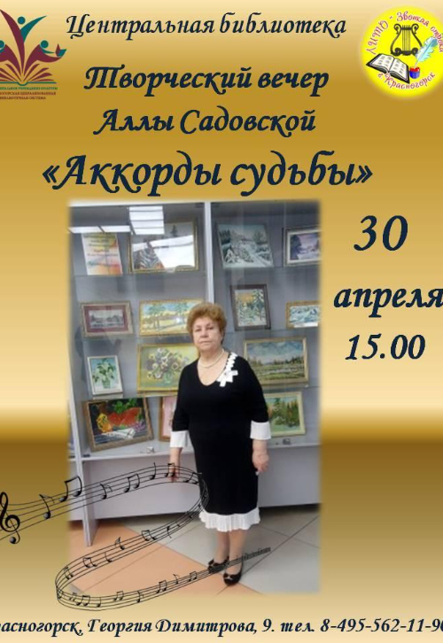 Друзья! Приглашаем вас 30 апреля в 15.00 на творческий вечер поэта, члена Литературного объединения "Звонкая строка", Аллы Дмитриевны Садовской - "Аккорды судьбы".