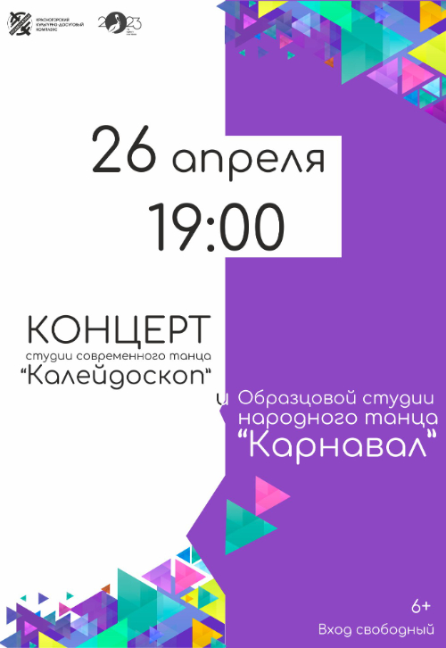 26 апреля в ДК "Подмосковье" состоится отчетный концерт Образцового коллектива "Студия народного танца "Карнавал" КДК "Мечта" (рук. Андрей Сапронов) и студии эстрадного танца "Калейдоскоп" (рук. Татьяна Сорокина).