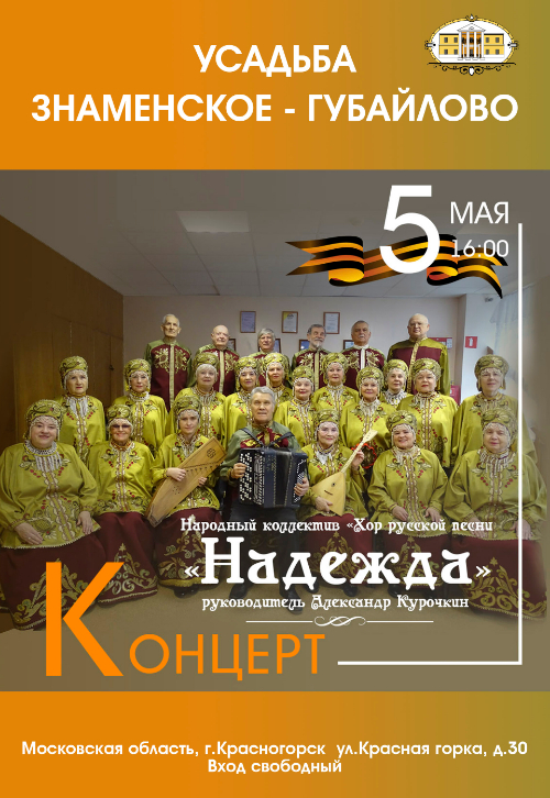 Народный коллектив "Хор русской песни "Надежда", руководитель Александр Курочкин, приглашает вас на концертную программу песен военных лет «Песни победного мая», которая состоится 5 мая в 16:00 в Главном доме Усадьбы Знаменское-Губайлово.
