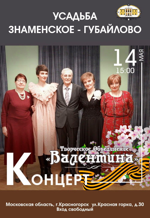 Творческое Объединение «Валентина» приглашает вас на концерт «Весна Победы!», который состоится 14 мая в 15:00 в Главном доме Усадьбы Знаменское-Губайлово.