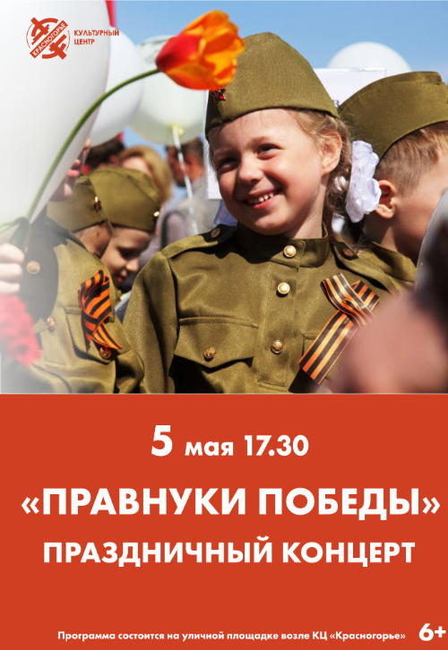 5 мая в 17:30, на уличной площадке, возле КЦ «Красногорье», состоится праздничная концертная программа «Правнуки победы», с участием творческих коллективов КЦ «Красногорье» и ЦДТ «Цветик-Семицветик».