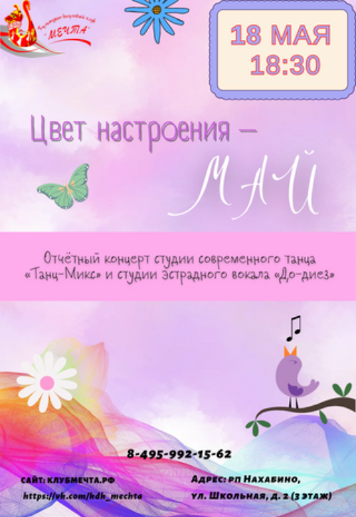 18.05.2023 18:30 – «Цвет настроения - МАЙ». Отчётный концерт студии современного танца «Танц-Микс» и студии эстрадного вокала «До-диез».