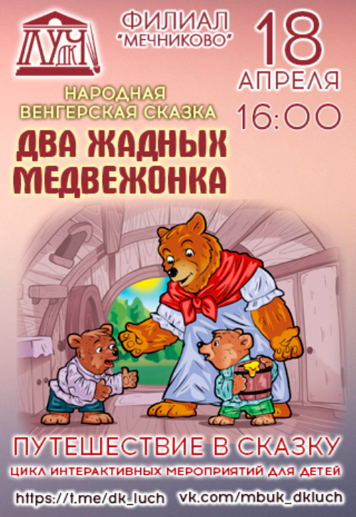 В филиале МБУК «ДК «Луч» «Мечниково» пройдет интерактивная программа для дошкольников «Путешествие в сказку» - «Два жадных медвежонка».