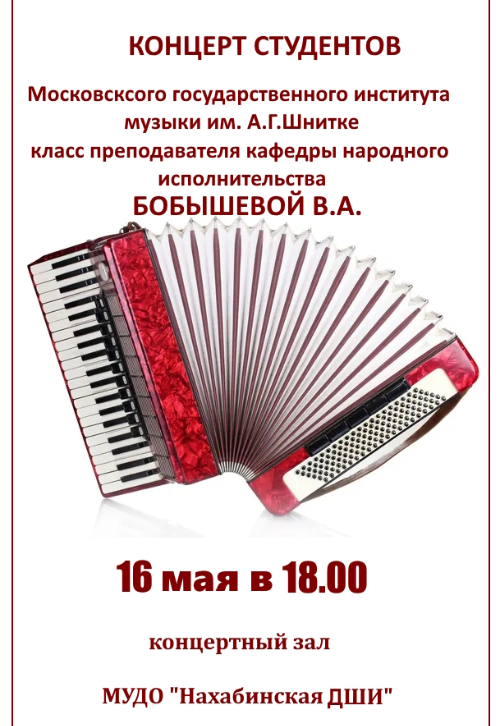 Концерт студентов класса преподавателя Бобышевой В.А. из МГИМ им. А.Г.Шнитке. Выступающие исполнят классические и современные произведения на народных инструментах - баяне, аккордеоне, домре балалайке.