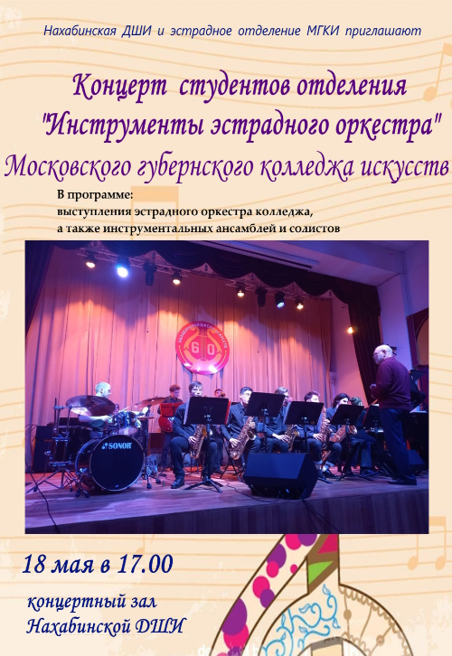 На сцене Нахабинской ДШИ выступят лучшие студенты эстрадного отделения Московского губернского колледжа искусств. Украшением концерта станет выступление эстрадного оркестра колледжа.