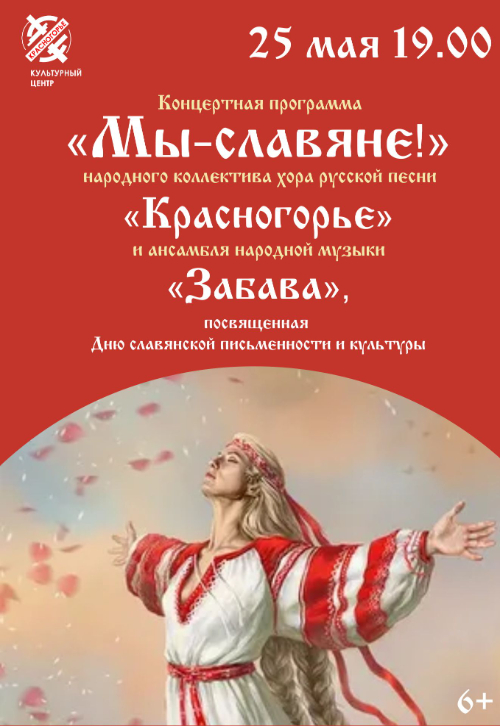 25 мая в 19:00 в КЦ «Красногорье» состоится концертная программа «Мы – славяне», народного коллектива хора русской песни «Красногорье» и ансамбля народной музыки «Забава», посвященная Дню славянской письменности.