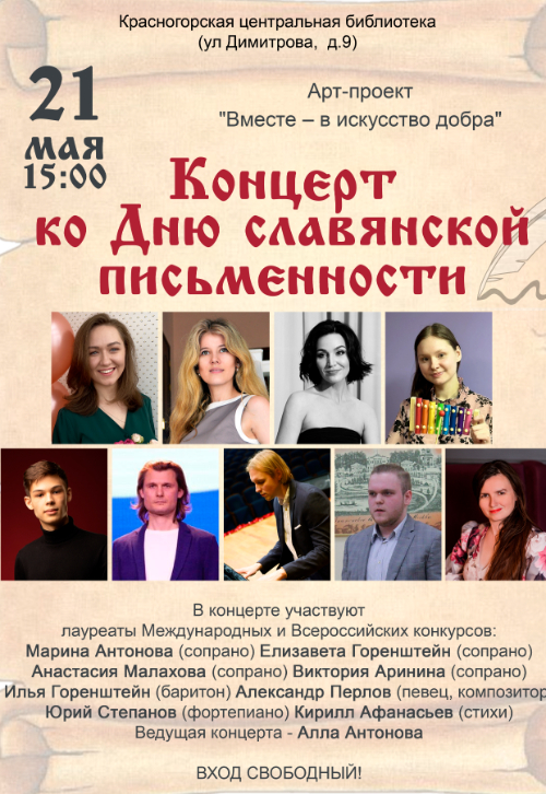 21 мая в 15.00 на концерт ко Дню славянской письменности. Для гостей выступят лауреаты Международных и Всероссийских конкурсов.
