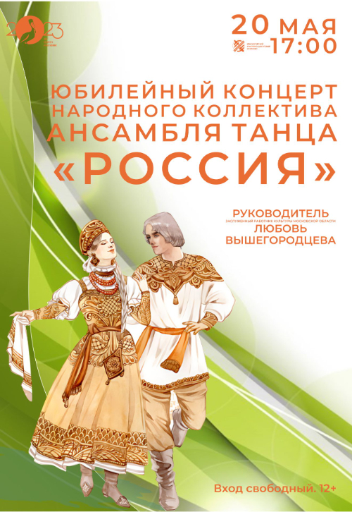 20 мая в ДК «Подмосковье» состоится юбилейный концерт Народного коллектива «Ансамбль танца «Россия» под руководством заслуженного работника культуры Московской области — Любови Вышегородцевой.