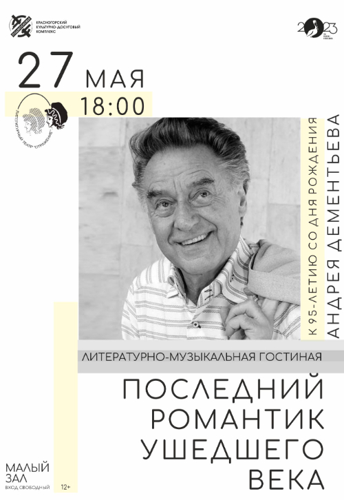 27 мая в малом зале ДК "Подмосковье" состоится литературно-музыкальный гостиная, посвященная 95-летию русского поэта, лауреата Государственной премии СССР, заслуженного деятеля искусств России Андрея Дмитриевича Дементьева.