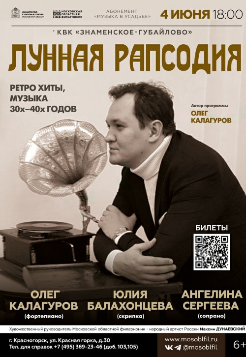 4 июня в 18:00 в Главном доме Усадьбы Знаменское-Губайлово состоится очередной концерт Абонемента «Музыка в усадьбе» "Времена года" ЛУННАЯ РАПСОДИЯ. РЕТРО ХИТЫ, МУЗЫКА 30-40х годов