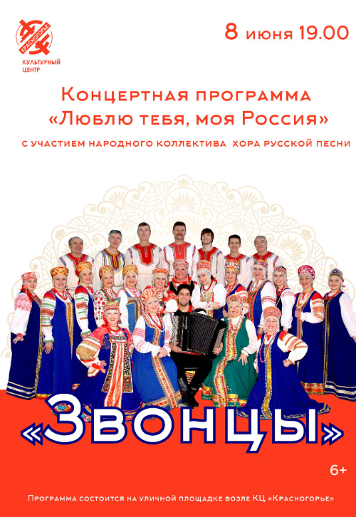 8 июня в 19:00 на уличной площадке, возле КЦ "Красногорье" состоится концертная программа «Люблю тебя, моя Россия», посвященная Дню России, с участием народного коллектива хор русской песни «Звонцы», художественный руководитель – Ирина Меркушова.