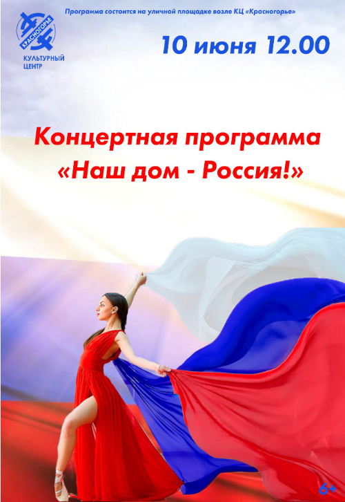 10 июня в 12:00 в КЦ «Красногорье» состоится концертная программа «Наш дом - Россия», посвященная Дню России, с участием творческих коллективов КЦ «Красногорье» и ЦДТ «Цветик-Семицветик».
