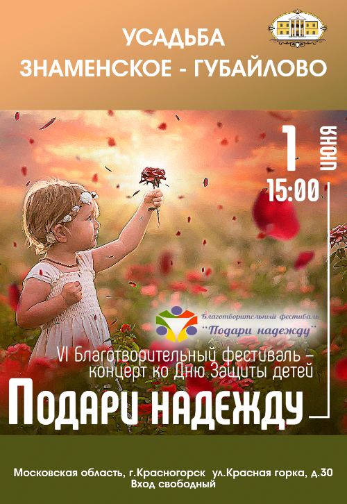 1 июня в 15:00 в Главном доме Усадьбы Знаменское-Губайлово состоится VI Благотворительный фестиваль – концерт ко Дню Защиты детей «Подари надежду», где примут участие ГБПОУ МО «Красногорский колледж» и Благотворительный арт-проект «Вместе – в искусство добра», автор и ведущая