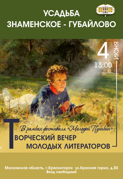 4 июня в 13:00 в Главном доме усадьбы Знаменское-Губайлово состоится Творческий вечер молодых литераторов «Наследники Пушкина. Традиции и современность»