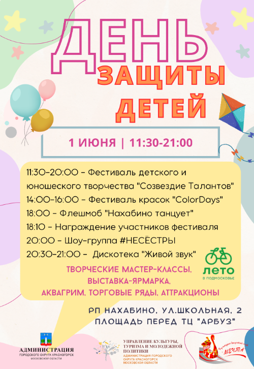 В программе: 11:30-20:00 Фестиваль детского и юношеского творчества «Созвездие талантов» 14:00-16:00 Фестиваль красок «ColorDays» 18:00 Флешмоб «Нахабино танцует» 18:10 Награждение участников фестиваля 20:00 Выступление Шоу-группы #НЕСЁСТРЫ 20:30-21:00 Дискотека «Живой звук»