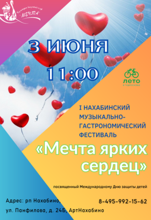 Первый музыкально - гастрономический фестиваль "Мечта ярких сердец" пройдёт в Нахабино. Цель фестиваля - развитие творческих способностей, художественного вкуса и познание окружающего мира у детей и объединения детей и взрослых в Нахабино. Выступят вокальные, инструментальные, танцевальные, театральные коллективы и ансамбли оригинального жанра, которые исполнят творческие номера на гастрономическую тему! На празднике будет множество вкусных сюрпризов! До встречи на фестивале!