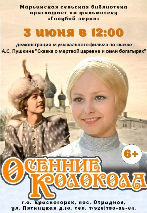 В преддверии Пушкинского дня Марьинская сельская библиотека приглашает 3 июня в 12.00 на показ музыкального фильма «Осенние колокола» - экранизацию «Сказки о мёртвой царевне и семи богатырях».