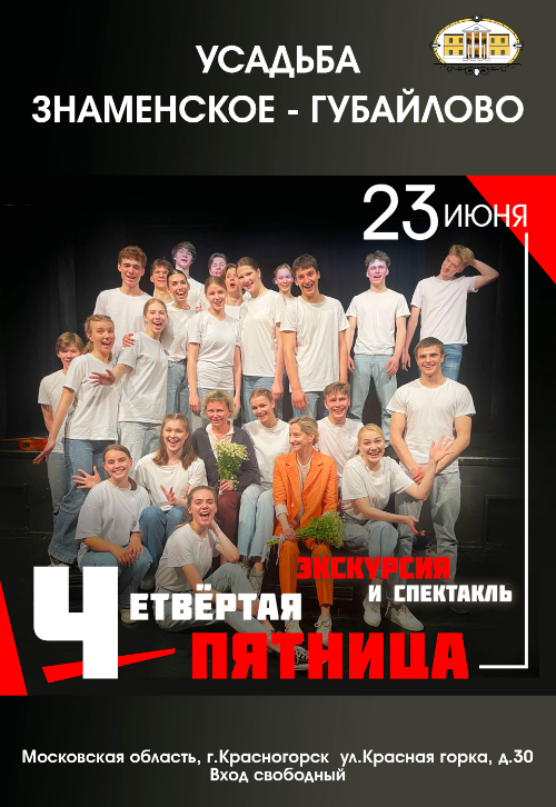В 17:00 вас ждёт обзорная экскурсия «Усадьба сквозь века: от основания до наших дней» с Федором Филипповичем Дерий, а в 18:30 спектакль «Маяковский. Время, голос, сцена» II курса Московского театрального колледжа им.Л.А.Филатова, режиссеры-педагоги: М.В.Гарсия и М.А.Зорина.