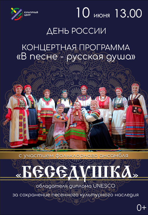 10 июня в преддверии празднования важного государственного праздника страны — Дня России — состоится программа на уличной площади КЦ "Архангельское".В рамках мероприятия народный коллектив фольклорный ансамбль "Беседушка" под руководством Оксаны Гладких выступит с концертной программой "В песне — русская душа". В исполнении коллектива прозвучат исконно русские песни, лучшие образцы деревенского фольклора, плясовые, хороводные, лиричсекие композиции разных регионов России — нашей необъятной Родины.