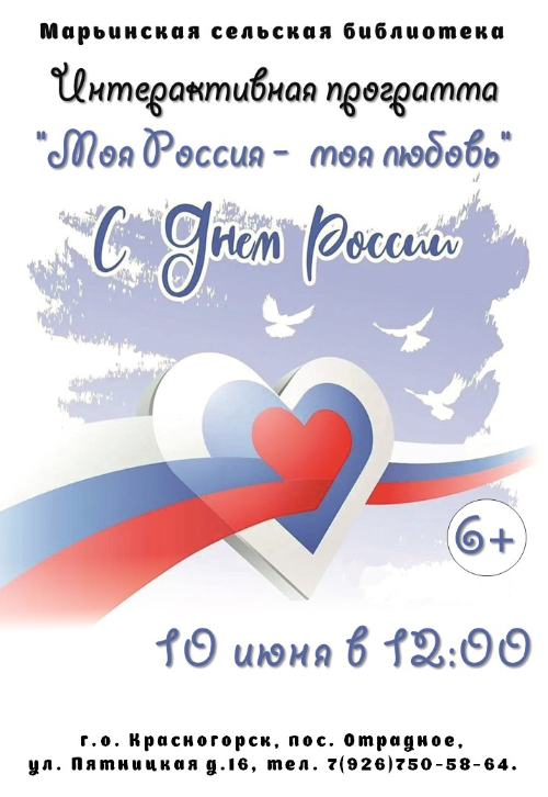 Марьинская сельская библиотека приглашает 10 июня в 12.00 на интерактивную программ « Моя Россия – моя любовь».