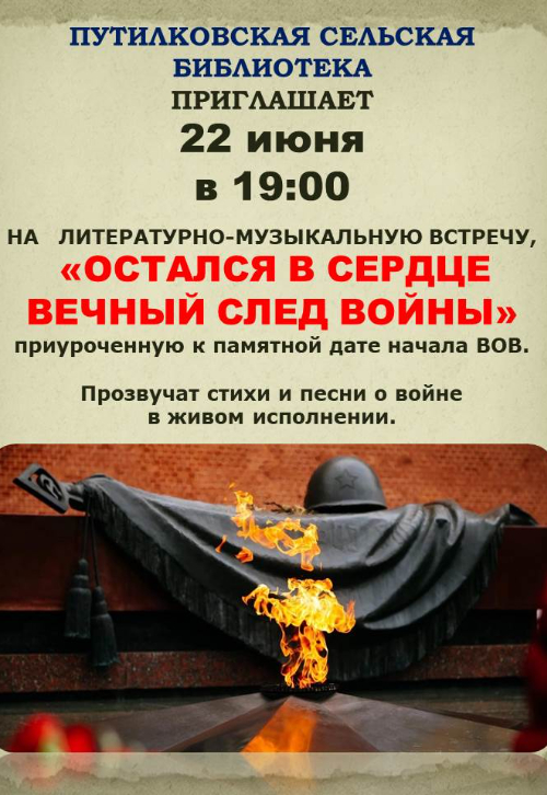 Друзья, Путилковская сельская библиотека приглашает вас принять участие в литературно-музыкальном вечере "Остался в сердце вечный след войны", посвященный памятному дню начала Великой Отечественной войны.