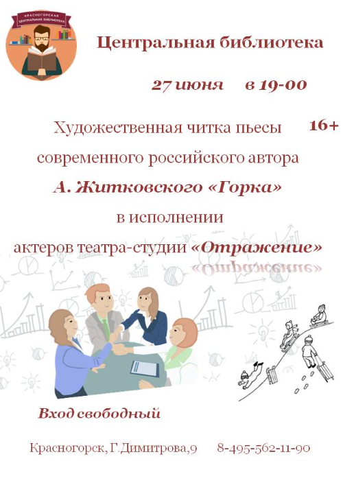 Друзья! 27 июня в 19.00 в Центральной библиотеке состоится художественная читка пьесы "Горка" современного российского автора А. Житковского в исполнении актеров театра-студии "Отражение".