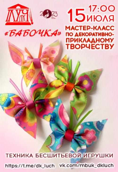 Кукла – это выражение знаний человека о мире и миропорядке, о месте его в этом мире. Традиционной игрушкой в быту русской деревни в крестьянских семьях с давних времён была тряпичная кукла. На Руси, да, впрочем, и у всех славянских народов было большое многообразие кукол. Многие тряпичные куклы несли двойное, иногда тройное назначение. Куклы были обережные, обрядовые, и просто обыкновенные игровые куклы, с которыми играли дети. Была даже такая примета – когда дети много и усердно играют в куклы, в семье прибыль; если же небрежно обращаются с игрушками, в доме быть беде. На мастер-классе, который проведёт руководитель творческой мастерской «Берегиня» Светлана Голенкова все желающие смогут изготовить из ярких лоскутов ткани «Бабочку», в технике бесшитьевой игрушки.
