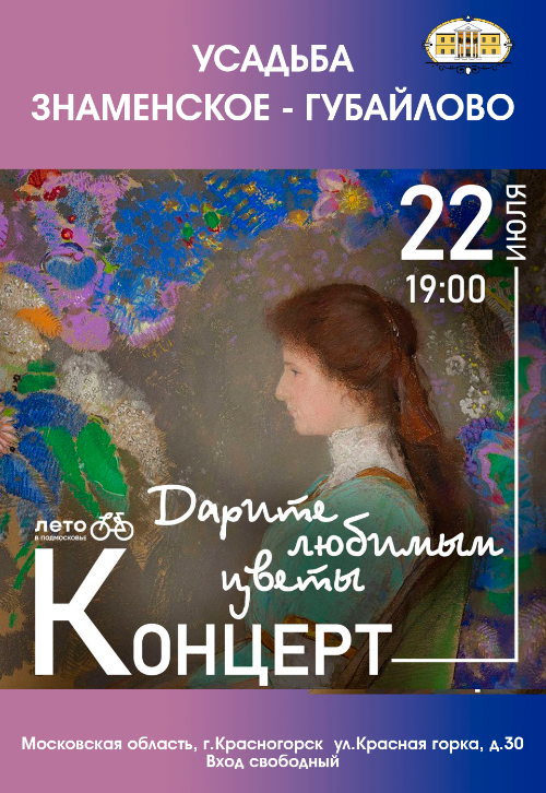 Приглашаем вас на концерт "Дарите любимым цветы", который состоится 22 июля в 19:00 в Главном доме усадьбы Знаменское-Губайлово.