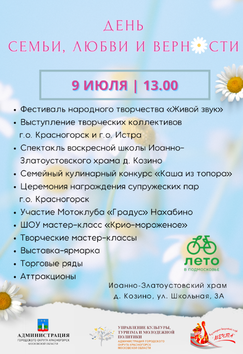 Центральной площадкой праздника в Нахабино традиционно станет Иоанно-Златоустовский храм в деревне Козино. 9 июля в 13.00 здесь пройдёт большой фестиваль народного творчества «Живой звук». А также в рамках мероприятия состоится семейный кулинарный конкурс «Каша из топора». В этот замечательный день для всех гостей храма пройдет праздничный концерт под открытым небом от лучших коллективов г.о. Красногорск и г.о. Истра. Для детей будут организованы различные творческие мастер-классы. Кроме того, для ребят и их родителей пройдет увлекательное Шоу «Крио-мороженое». На протяжении всего праздника будут работать: аттракционы, фут-корт, выставка-ярмарка, красочная фотозона. Символической изюминкой праздника станет церемония награждения супружеских пар, которые подают пример крепости семейных устоев. Пары получат дипломы и памятные подарки от организаторов и партнёров.