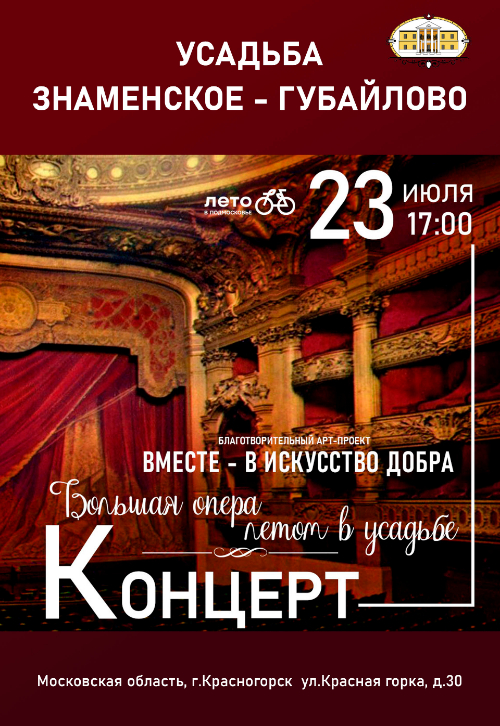 23 июля в 17.00 приглашаем вас на концерт «Большая опера летом в усадьбе» Благотворительного арт-проекта «Вместе – в искусство добра», автор и ведущая - Алла Антонова.