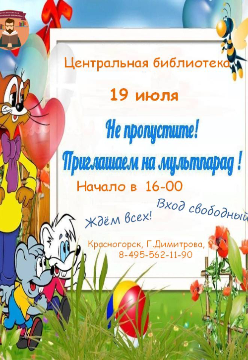 19 июля в 16.00 мультпарад в ЦЕНТРАЛЬНОЙ БИБЛИОТЕКЕ .