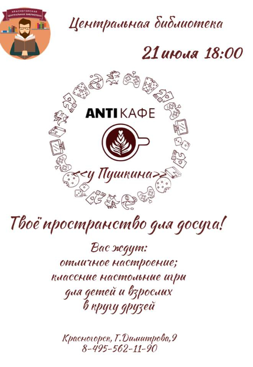 Друзья! АнтиКафе «У Пушкина» продолжает свою работу в Центральной библиотеке!
