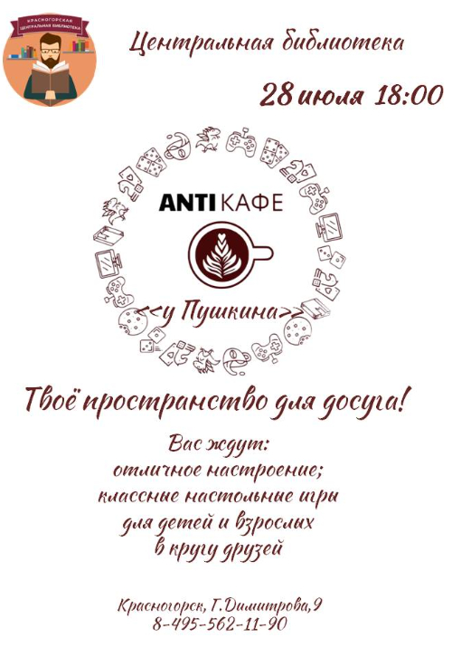 Друзья! АнтиКафе «У Пушкина» продолжает свою работу в Центральной библиотеке!