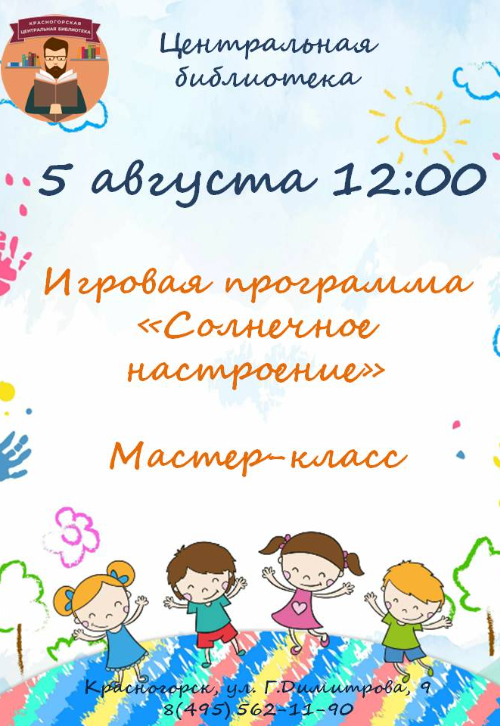 Приглашаем юных друзей 5 августа в 12.00 в Центральную библиотеку на игровую программу "Солнечное настроение".