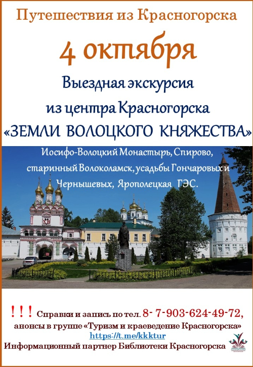 4 октября состоится выездная экскурсия "Земли Волоцкого княжества". Красивейшие места, просторы, Храмы, Иосифо-Волоцкий Монастырь, старинный Волоколамск, усадьбы Гончаровых и Чернышевых... Древняя история, старые стены и легенды соборов; блистательный 18 век, поэтичный 19-ый и технологичный 20-й.